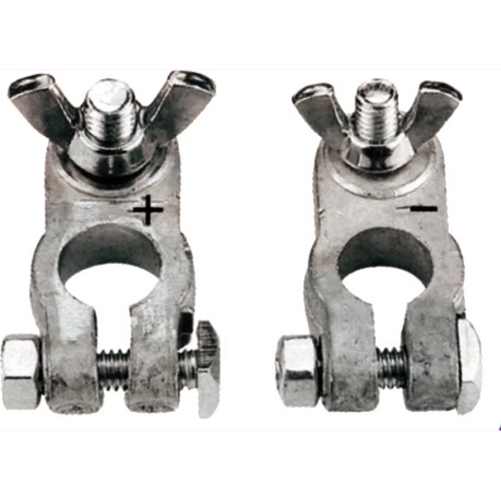 Sett med pluss og minus. Leveres 8 mm bolt på - pol og 10 mm bolt på + pol. Vingemutter for enkel påmontering av kabel.