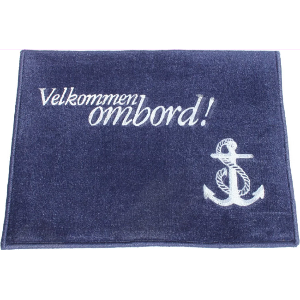 Matte "Velkommen ombord" 61x45 cm Marineblå matte med hvit tekst/anker. Kraftig sidekant. Underside med antiskli. Lengde: 61 .. Mer info