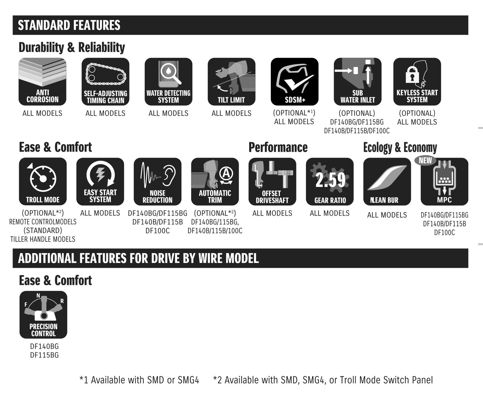 Verdens første 140Hk 4-taktsmotor med drive-by-wire. DF140BG gir forenklet rigging, silkemyk giring, øyeblikkelig gass/girrespons og god drivsøkonomi. Enkelt vedlikehold * Oljefilter er designet for lett tilgang. * Oljeutslipp og bredere oljenivåhull (Ø15mm) gjør det enkelt å skifte olje. * Strømlinjeformet og sporty design Forbedret girkasse