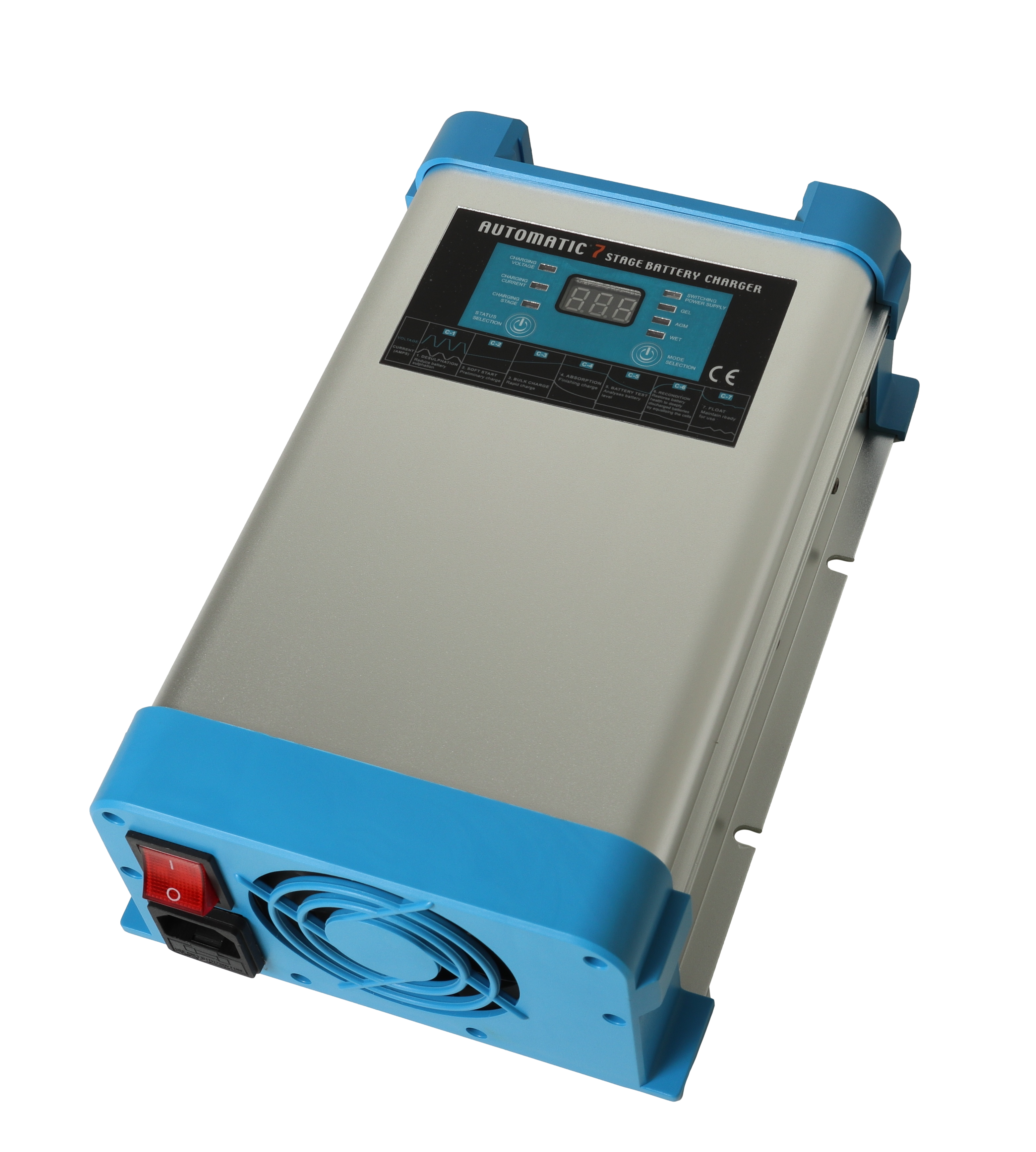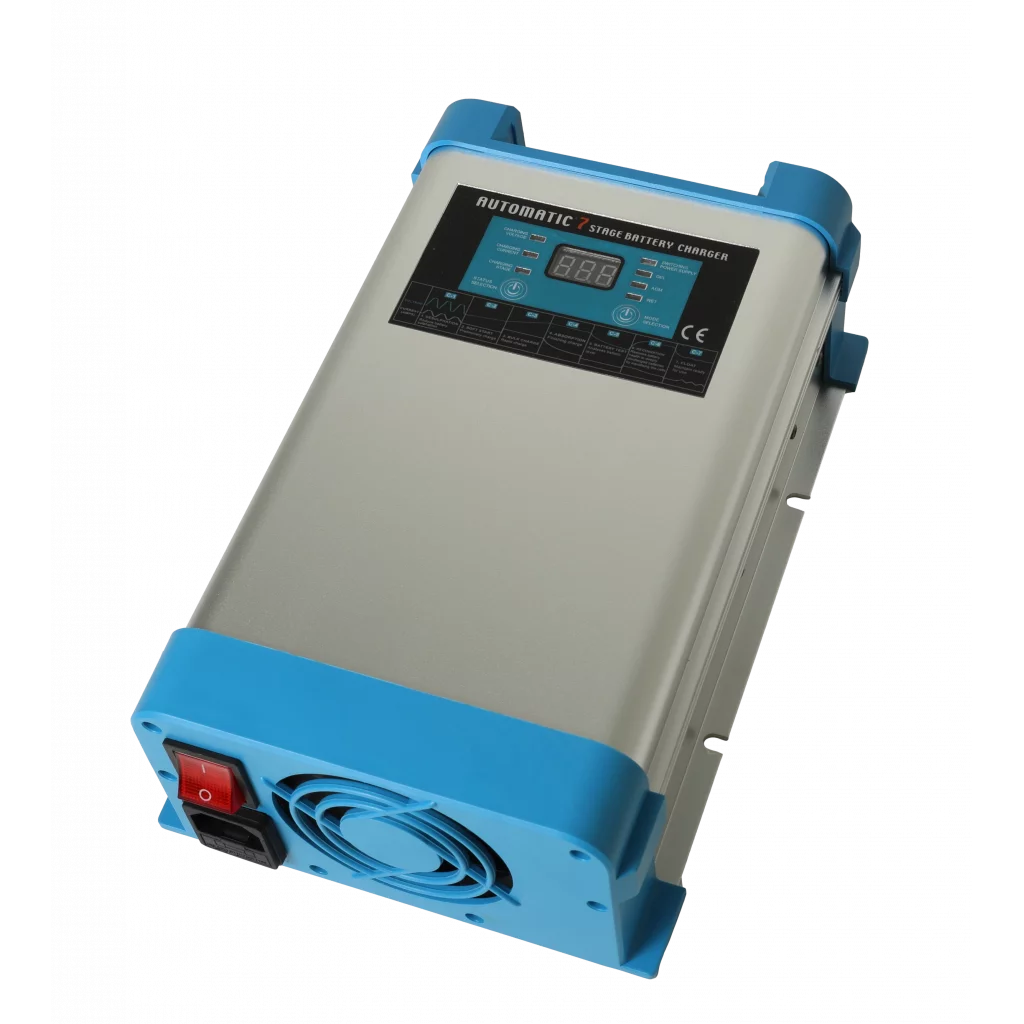 - Digitalt display viser spenning (V), ladestrøm (A) og hvor langt laderen er kommet i ladeprosessen